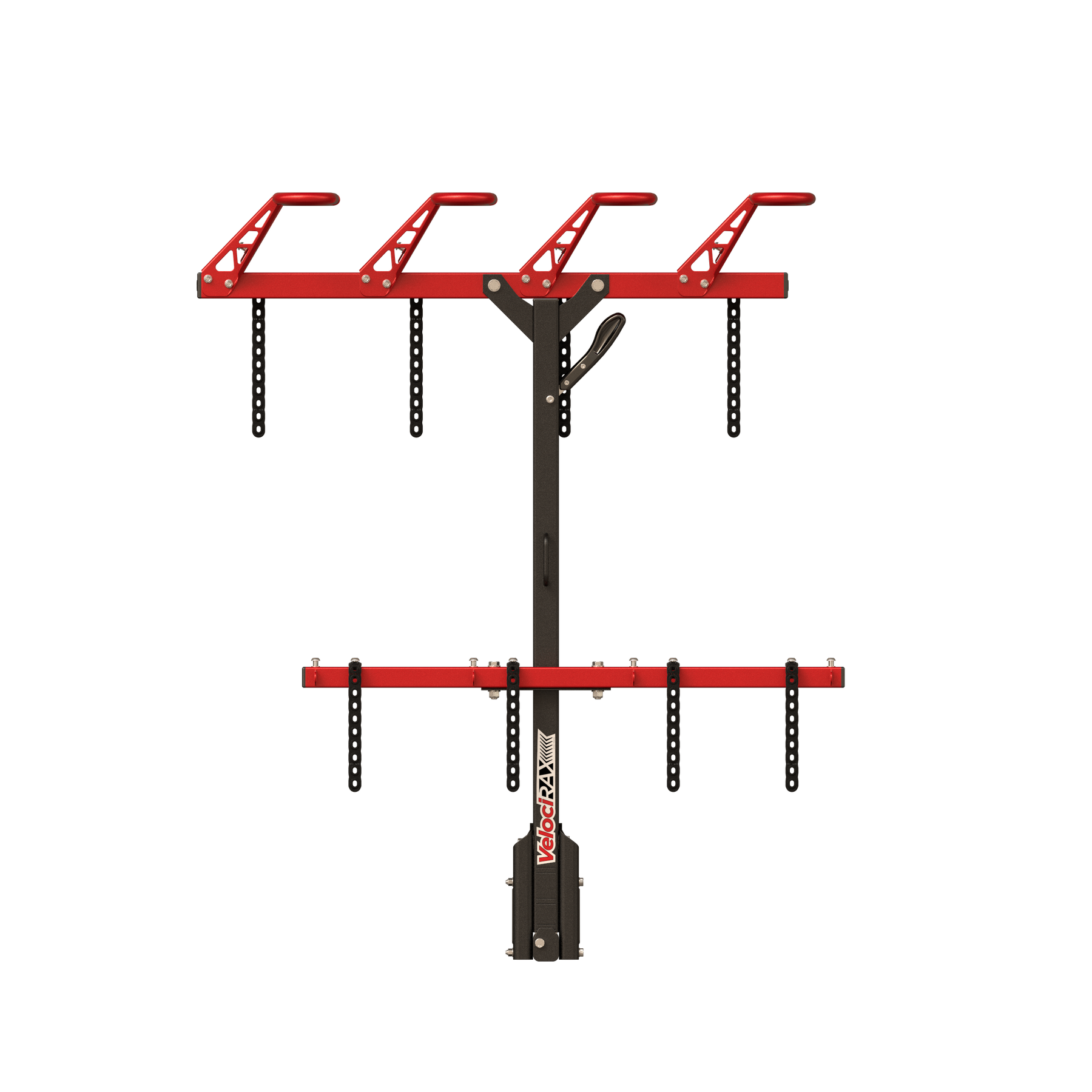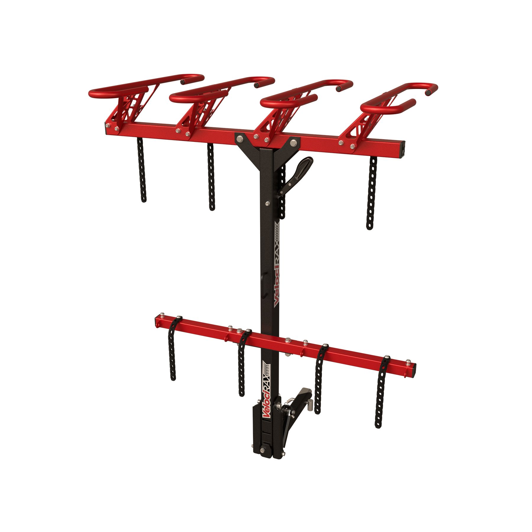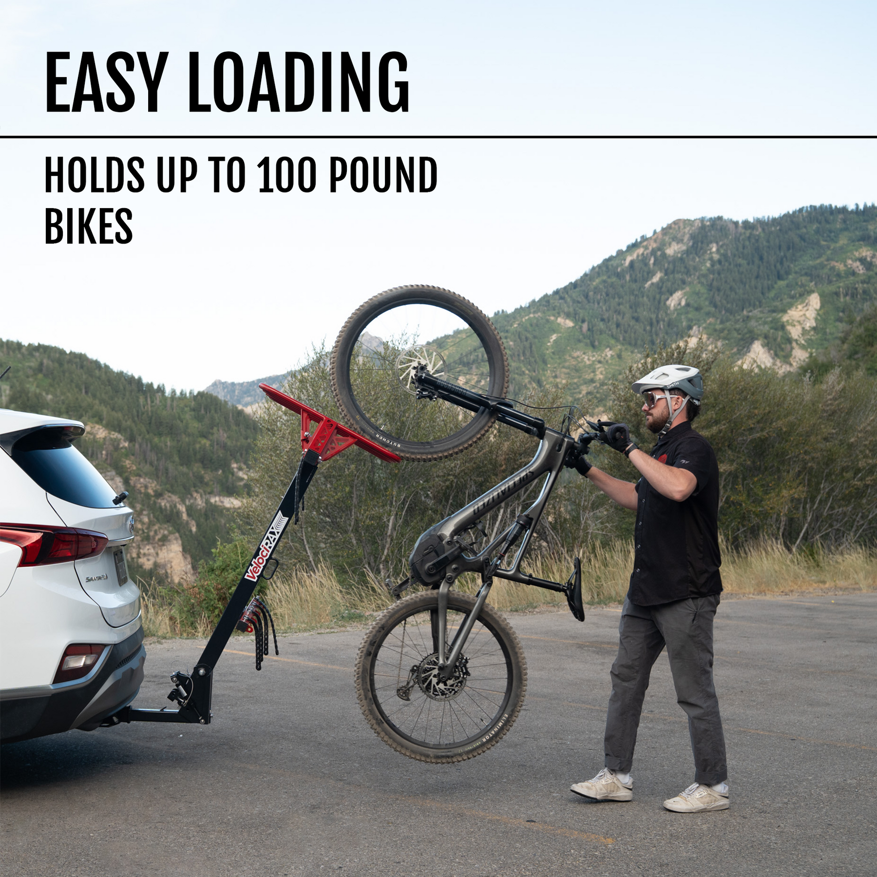 - RVs/Trailers: you will need to have a Class III 50mm (2 inch) hitch receiver (tow bar) with a tongue weight capacity of 227 kg (500 lbs) at a minimum (bumper hitches, extension hitches, and hitches with cantilevered sections allow too much hitch movement and are inadequate). One item to check is if a ladder could possibly interfere with the rack. Trailers and RVs produce extreme forces on racks and bikes. Take extra care to strap tight and use rubber bands (or bike tubes cut in ~ 25mm (1 inch sections)) placed on the brake levers to decrease natural motion between bike and rack and fully secure the VelociRAX's built-in anti-rattle system.