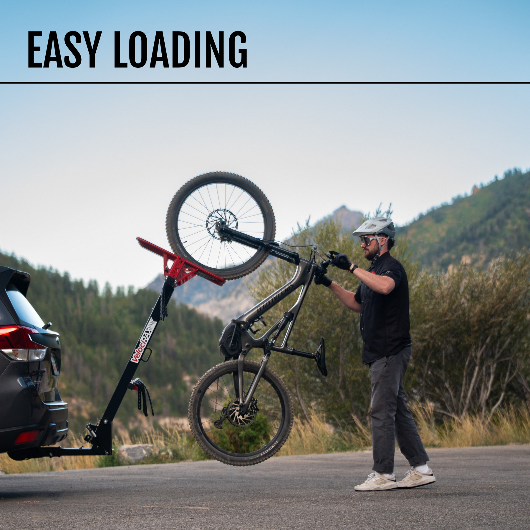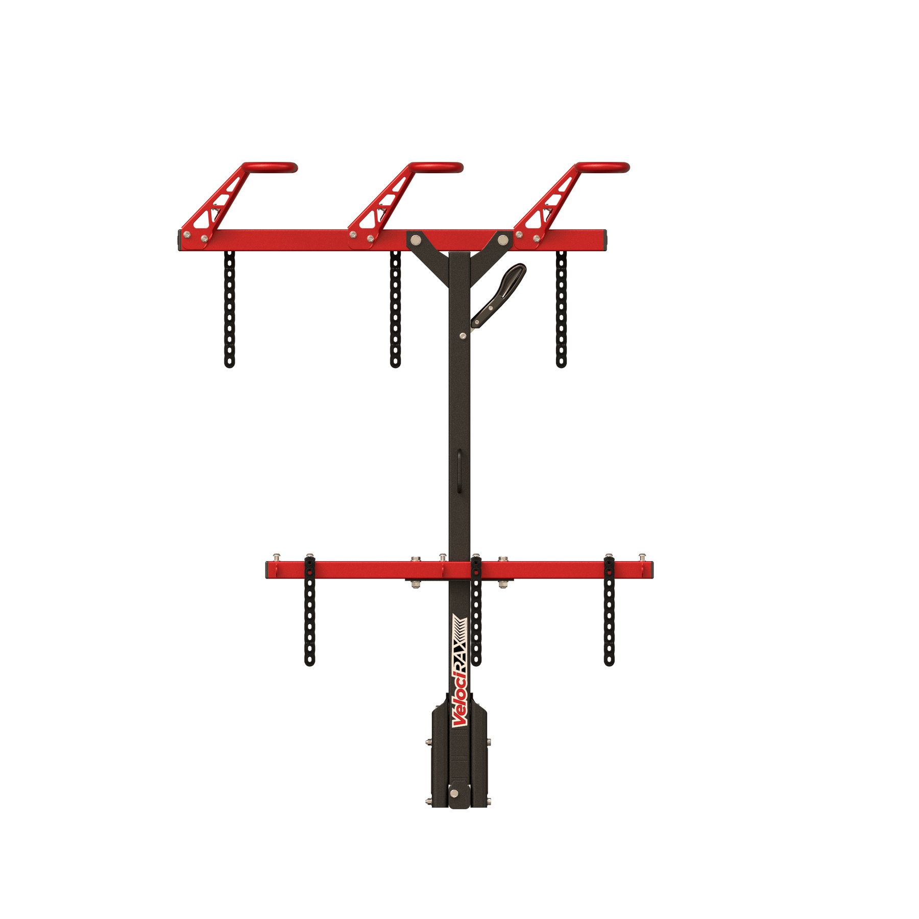 - RVs/Trailers: you will need to have a Class III 50mm (2 inch) hitch receiver (tow bar) with a tongue weight capacity of 227 kg (500 lbs) at a minimum (bumper hitches, extension hitches, and hitches with cantilevered sections allow too much hitch movement and are inadequate). One item to check is if a ladder could possibly interfere with the rack. Trailers and RVs produce extreme forces on racks and bikes. Take extra care to strap tight and use rubber bands (or bike tubes cut in ~ 25mm (1 inch sections)) placed on the brake levers to decrease natural motion between bike and rack and fully secure the VelociRAX's built-in anti-rattle system.